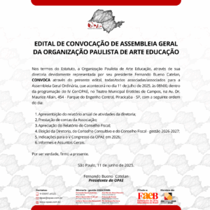 A Organização Paulista de Arte Educação convida todas as associadas e todos os associados a participarem da Assembleia Geral Ordinária, que acontecerá no dia 11 de julho de 2025, às 08h00, durante a programação do IV Congresso da OPAE (ConOPAE), no Teatro Municipal Erotides de Campos, em Piracicaba/SP.